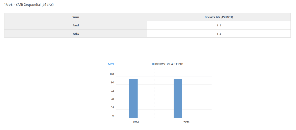 The AS1102TL features a single 1GbE Ethernet port, providing stable read/write speeds up to 113 MB/s in RAID 1. While it doesn’t support 2.5GbE like some competitors, it still delivers reliable speeds for home and small office use.