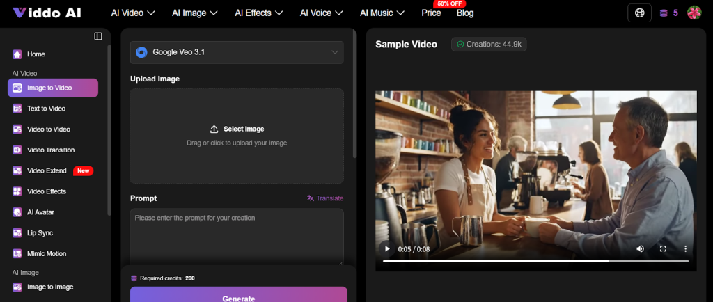 - Image to Video AI: Users simply upload an image and Viddo AI uses advanced technology to create a video based on that image with added motions/transitions/effects.